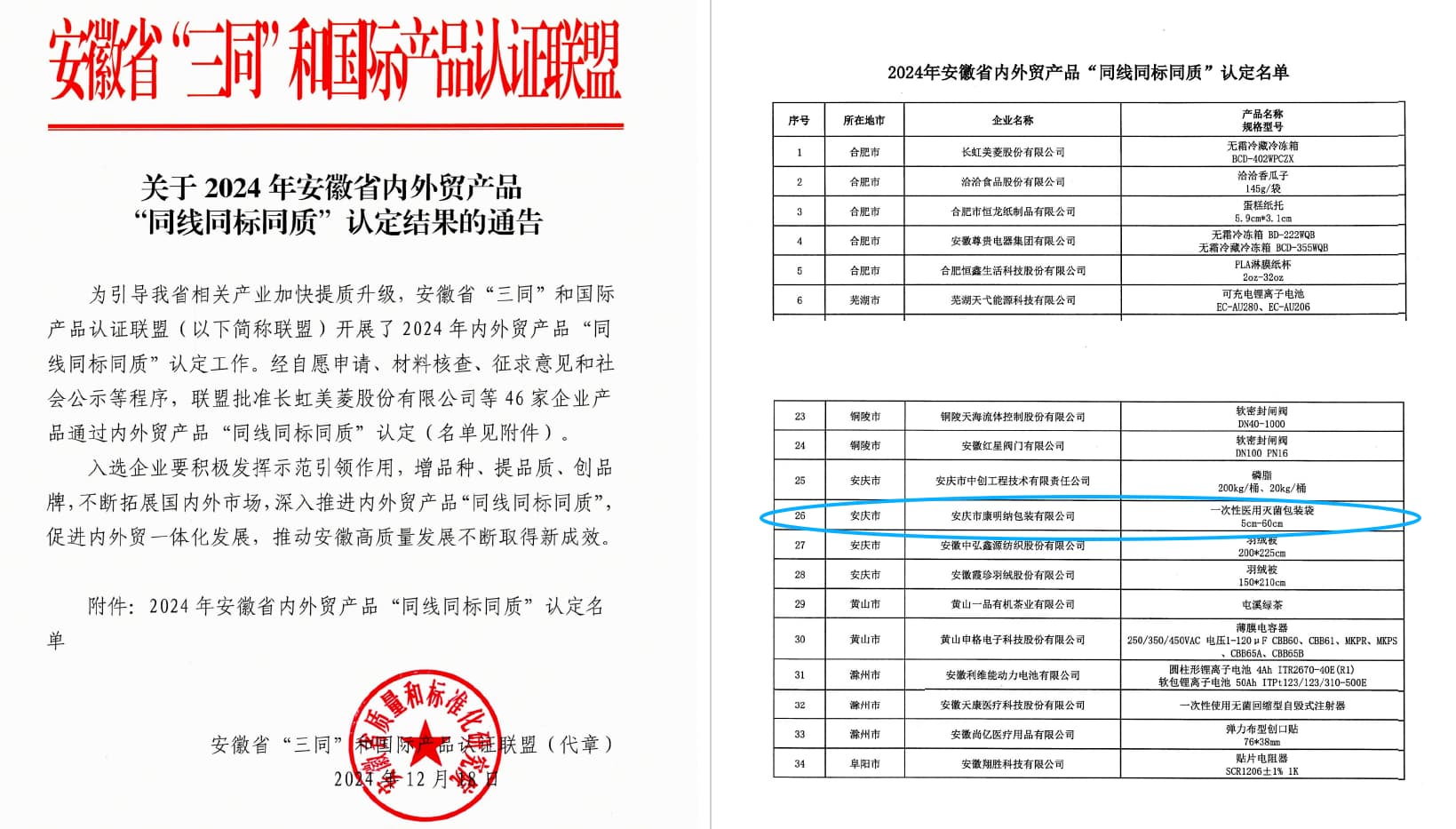 Kangmingna News | Kangmingna Group Selected into the 2024 Anhui Province "Same Line, Same Standard, Same Quality" Certification List
