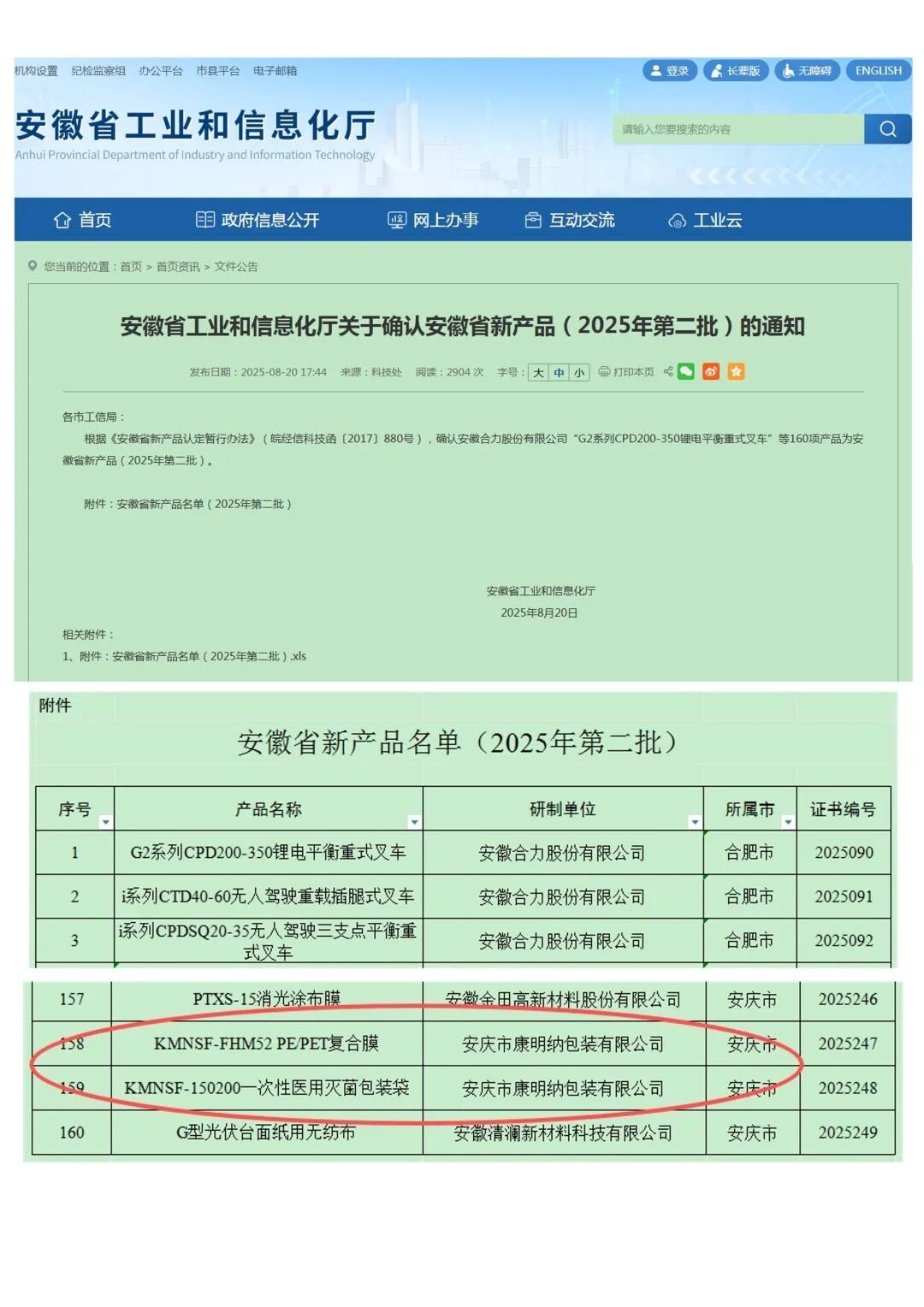 On the road of technological innovation and product upgrading, Kangmingna has once again achieved new breakthroughs! Our two products, KMNSF-FHM52 PE/PET composite film and KMNSF-150200 disposable medical sterilization packaging bag, have been recognized as provincial-level new products. Our company has been actively exploring independent innovation research and development, technological processes, and other aspects. KMNSF-FHM52 PE/PET composite film has been innovatively optimized in terms of raw material selection and production process, with excellent physical properties and chemical stability, which can better meet the strict requirements of medical packaging for barrier properties, flexibility, and other aspects; The KMNSF-150200 disposable medical sterilization packaging bag is designed and manufactured with full consideration for medical use scenarios, strictly following the ISO13485 certification standard to ensure that each product meets international and domestic medical standards. It has the characteristics of high temperature and high pressure resistance, easy heat sealing, and is suitable for packaging, storage, and steam sealing of various medical devices EO、 Sterilization methods such as plasma and formaldehyde. This recognition is a recognition of Kangmingna's years of focus on research and development and adherence to quality. Our company will continue to uphold the spirit of innovation, increase research and development investment, continuously optimize product performance, and improve product quality.