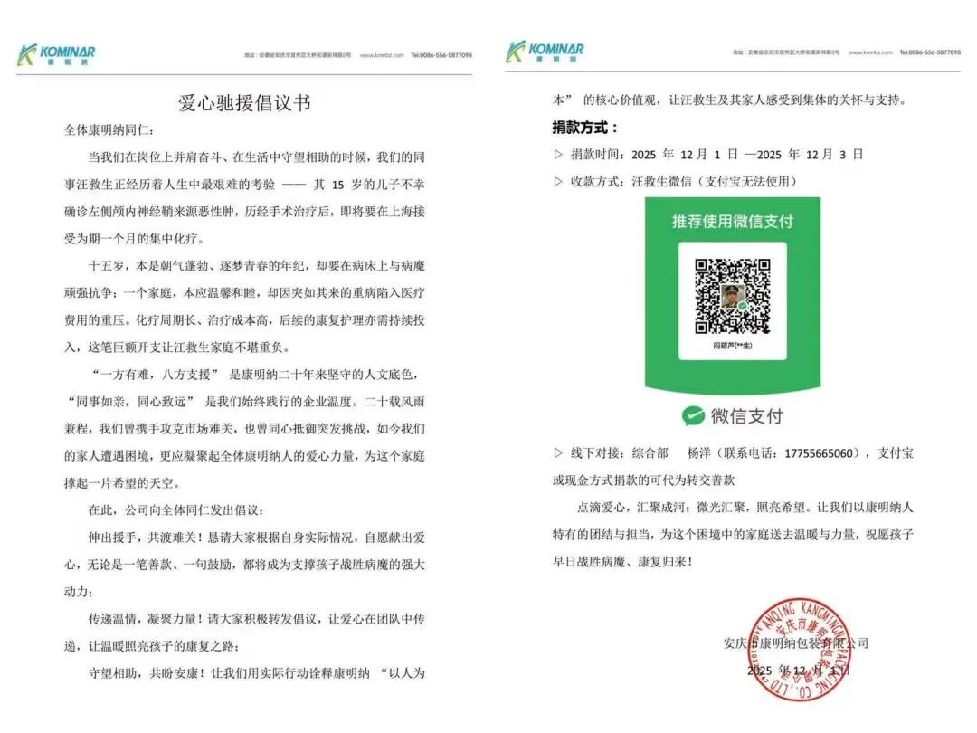 Recently, a colleague's child from the production department at Conmecunne was unfortunately diagnosed with a malignant tumor originating from the left intracranial nerve sheath. The high cost of treatment has plunged this ordinary family into a difficult situation. Upon hearing the news, a warm current of "Conmecunne family" quickly surged - company leaders immediately inquired about the situation, and colleagues from various departments came forward to lend a helping hand. A spontaneous charity donation was warmly staged within the company.